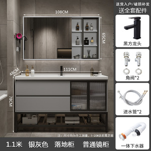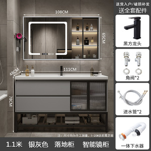 シルバーグレーガラスドアスマートミラーキャビネット+フロアキャビネット+フラット洗面器-1.1m [ハードウェアアクセサリーのフルセットが付属しています。]