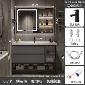 アイアングレーガラスドアスマートミラーキャビネット+フロアキャビネット+フラット洗面器-70cm【金具付属品一式無料】