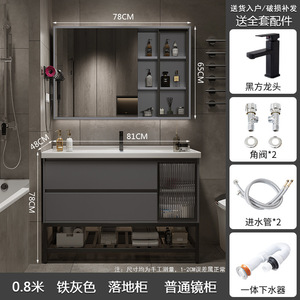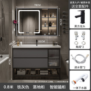 アイアングレーガラスドアスマートミラーキャビネット+フロアキャビネット+フラット洗面器-80cm【金具付属品一式無料】