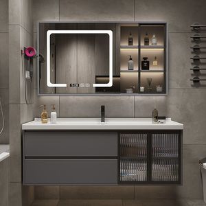 シルバーグレーガラスドアスマートミラーキャビネット+ウォールキャビネット+フラット洗面器-1m [ハードウェアアクセサリーのフルセットが無料。]