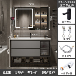 シルバーグレーガラスドアスマートミラーキャビネット+フロアキャビネット+フラット洗面器-80cm【金具付属品一式無料】