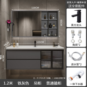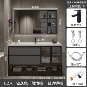 アイアングレーガラスドア普通ミラーキャビネット+フロアキャビネット+フラット洗面器-1.2m【金具付属品一式無料】