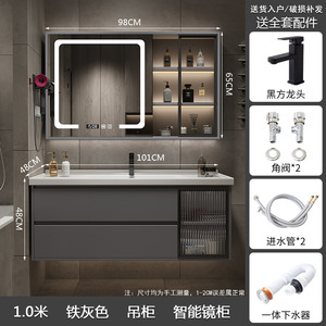 アイアングレーガラスドアスマートミラーキャビネット+ウォールキャビネット+フラット洗面器-1m [ハードウェアアクセサリーのフルセットが無料。]