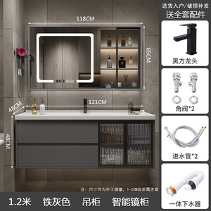 アイアングレーガラスドアスマートミラーキャビネット+ウォールキャビネット+フラット洗面器-1.2m [ハードウェアアクセサリーのフルセットが無料。]