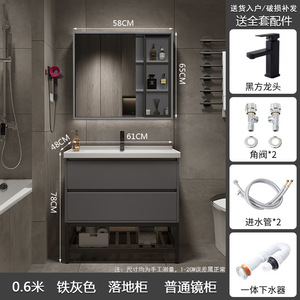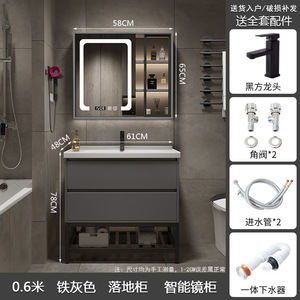 アイアングレーガラスドアスマートミラーキャビネット+フロアキャビネット+フラット洗面器-60cm【金具付属品一式無料】