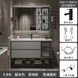 シルバーグレーガラスドア普通ミラーキャビネット+フロアキャビネット+フラット洗面器-80cm【金具付属品一式無料】