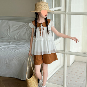 女の子ショーツスーツ夏 2025 新しい中型および大型子供人形襟ファッショナブルなノースリーブ 2 点セット夏服トレンド