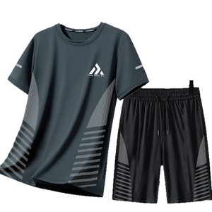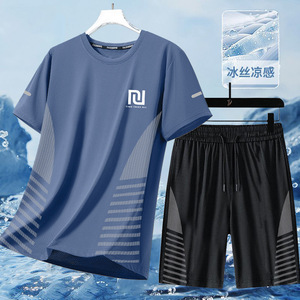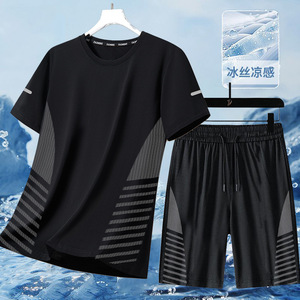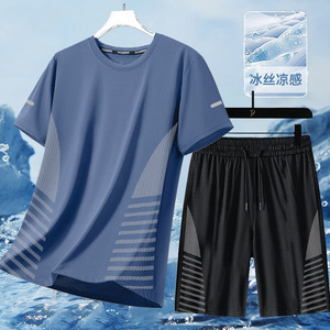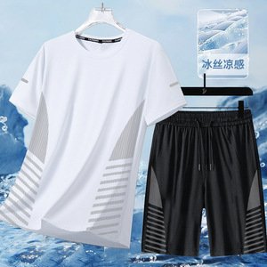 速乾性スポーツスーツメンズ夏薄い弾性ランニングフィットネス速乾性服メンズアイスシルクメッシュ半袖ショーツ