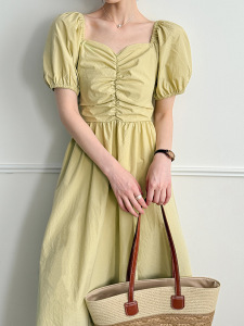 Juzhi 福祉モデル 返品交換不可~ハイウエストパフスリーブワンピース レディース 鎖骨露出プリーツゆったり 8806-1