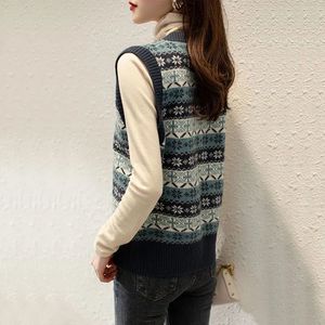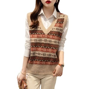 2025春秋季女士新款复古针织衫马甲拼色提花百搭无袖V领毛衣背心