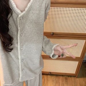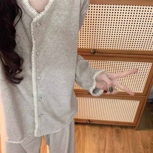 韩系可爱花边拼接V领长袖睡衣女春秋新款长袖长裤家居服套装外穿