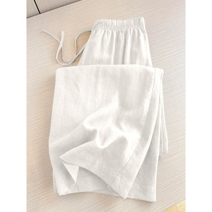 ミニマリストの服装〜女性用ブラックテンセルリネンカジュアルパンツ、ウエストゴム付きストレートレッグフロアレングスパンツ