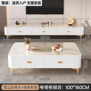コーヒーテーブルとテレビキャビネットの組み合わせ雪山白岩板+白キャビネットゴールド飛行機脚100+160