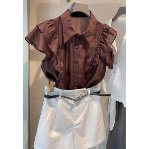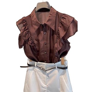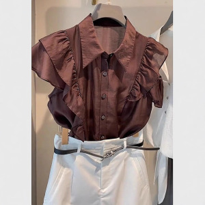 ユニークで美しい夏の薄手のトップス、フランスのハイエンドデザイン、軽い高級感、年齢軽減、西洋風のキャラメルカラーフリルシャツ