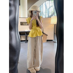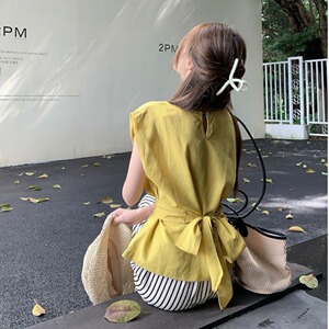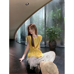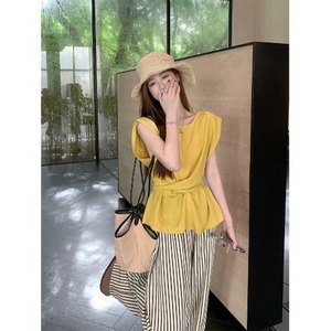 女性用フレンチスリーブコットンとリネンシャツ、ユニークなデザイン、ウエストと背中の中空ストラップ付きベスト、夏用