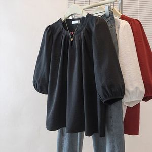 大きいサイズ韓国デザイン無地パフスリーブ Tシャツ女性のための 2025 春夏新作ルーズスリム七分袖トップ