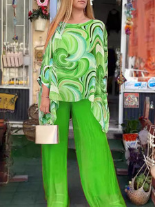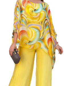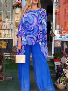 アマゾン2025夏 欧米風カラフルシフォンセットアップ 丸首トップス プリントパンツ ツーピースセット 特大サイズ
