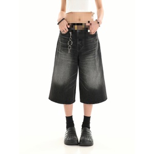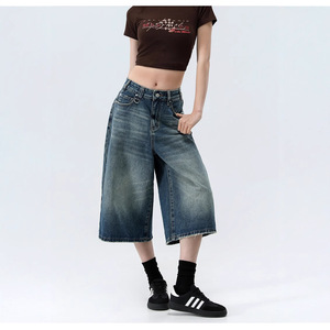 アメリカンレトロな女性の夏のハイストリートルーズシルエットウォッシュ加工オールドクロップドデニムショートパンツデザインワイドレッグミッドパンツ