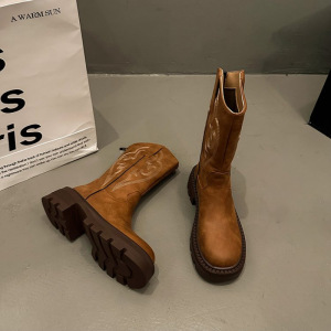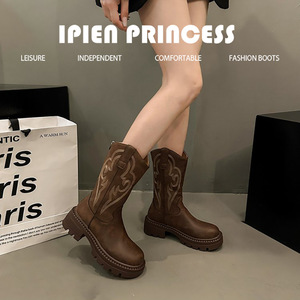 レトロエスニック風刺繍ミッドカーフブーツマーティンブーツ2025夏新作厚底小柄ウエスタンカウボーイブーツ