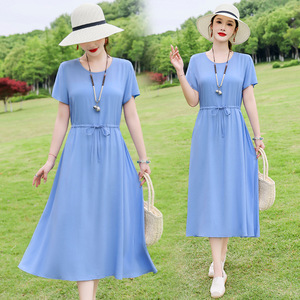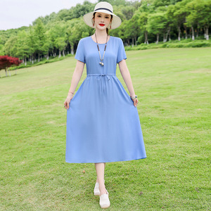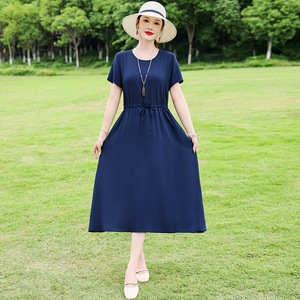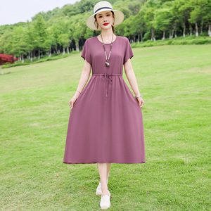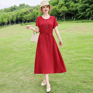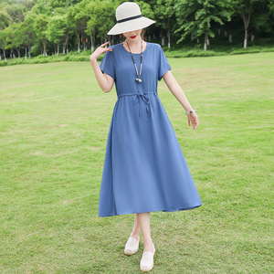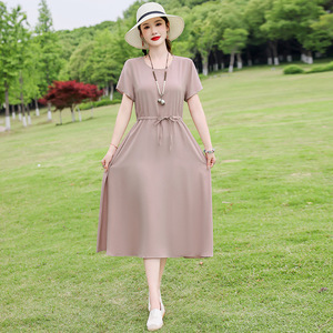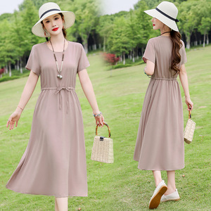夏の新しいコットンシルクドレス半袖フレンチレースアップ気質ロングスカートピンクウエスト痩身ドレス