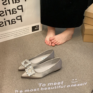 フレンチスタイルの女性用サテンシューズ、春のポインテッドトゥラインストーンスクエアバックル、スカート付きフラットシューズ
