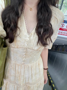 在庫ありティーブレイクフレンチVネックイエローパフスリーブドレスレディース2025年夏新作気質ウエストスカート