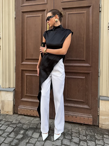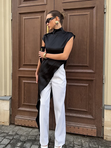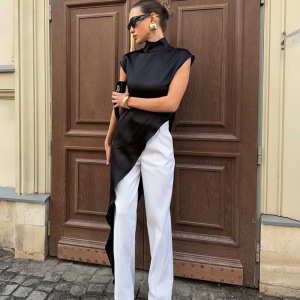 サマーサテンハイエンドルーズハイネックノースリーブファッションデザイン非対称スカートヨーロッパとアメリカの女性のためのカジュアルドレス