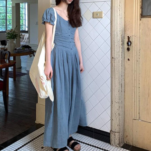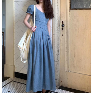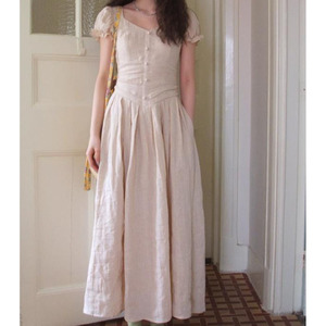 リネン気質ドレス 2025 夏フレンチレトロ半袖ミドル丈