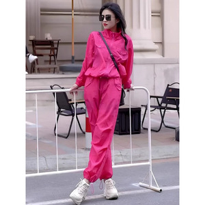 ローズレッドカジュアルスポーツスーツ女性用アウトドアフィットネスランニング巾着ジャケットレギンスパンツ春服一式セット