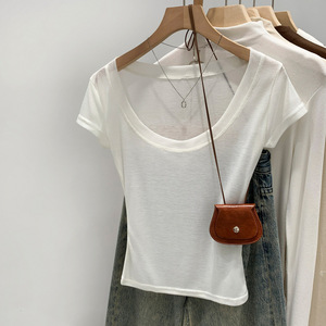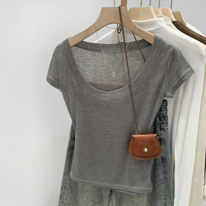 ホット販売パープル薄型 U ネックスリム半袖 Tシャツ女性のための 2025 夏の新しいユニークな美しい年齢を減らすトップ