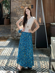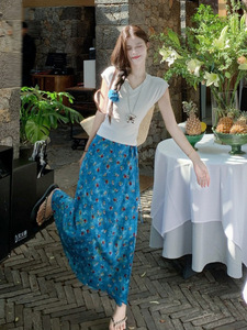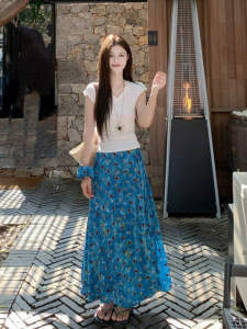 ブルー花柄油絵レースアップスカート女性のための 2025 夏の新作スリム V ネック半袖 T シャツ 2 点セット