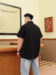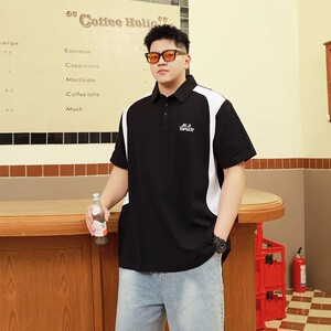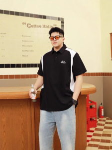 潮牌大码男装夏季拼色宽松翻领短袖POLO衫男胖子拼接五分半袖上衣