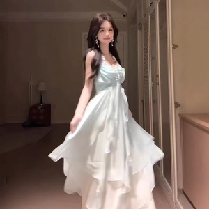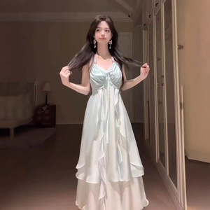 フレッシュでスイートな海辺のリゾートスタイルの女性用サスペンダードレス2025夏の新しい雰囲気のバックレスロングスカート