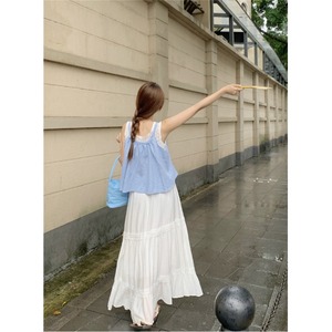 ドーパミンブルー美しいサスペンダートップ女性の夏のアウターレースステッチ偽ツーピースチェック柄ベストシャツ