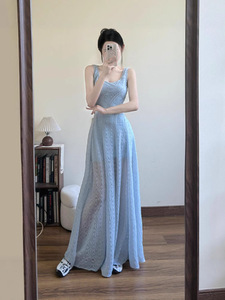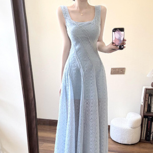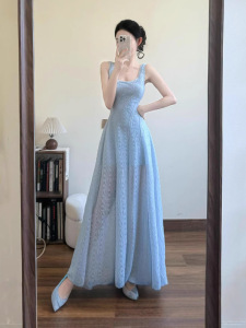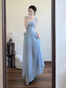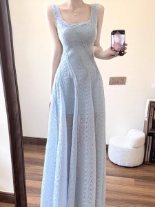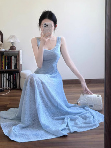 フレンチピュアデザイアビーチバケーションブルーサスペンダードレスレディースデザインウエストノースリーブベストロングスカート夏