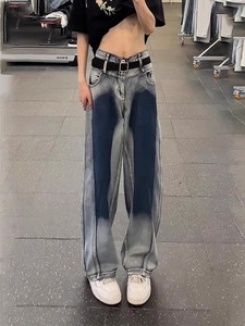 蓝色扎染渐变阔腿牛仔裤男款美式高街设计感裤子显腿长直筒弯刀裤
