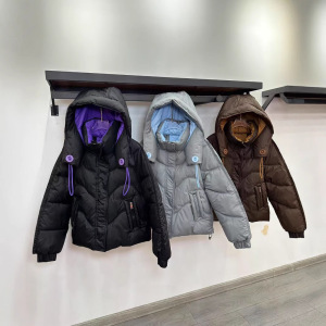 防寒服女性のショートフード付きコントラストカラー外国貿易モデル 2025 冬の新スタイル大きなボタンカジュアル綿コート