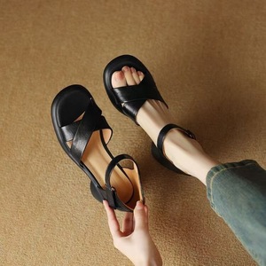 女性用サンダル 2025 夏新作ソフトレザー厚底プラットフォームオープントゥカジュアルフラットハイヒールローマンサンダル