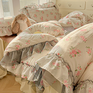 フレンチクラウド感しわ糸4点セット ベッドスカート風 プリンセス風レースキルトカバー ベッドシーツ 学生3点セット