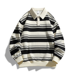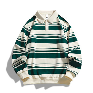 クロスボーダーメンズTシャツ春秋ポロストライプスウェットシャツ暖かいゆったり秋ラペル長袖万能長袖Tシャツ