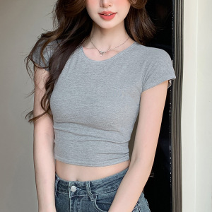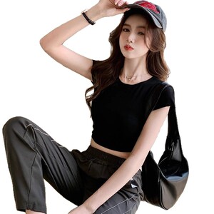 女性用ショート丈へそ出し半袖Tシャツ、2025年夏ホットガールズホワイト右肩ボトムシャツ、レディーストップス、へそ出しトップス