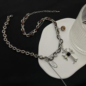 レターメダルクロスレザーチェーンネックレス