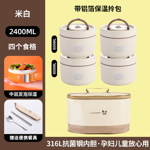 クリームホワイト-【保温モデル】4層2.4L(大4)+食器+保温バッグ