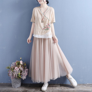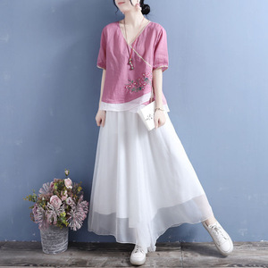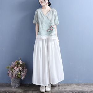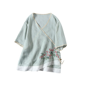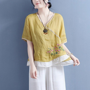古典文学と芸術の新しい中国風の夏の綿とリネンのVネック半袖トップス、カラーブロックダブルボタン中国風プルオーバーTシャツ