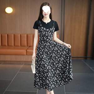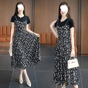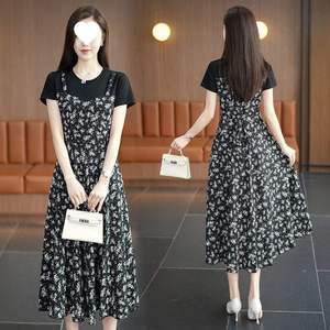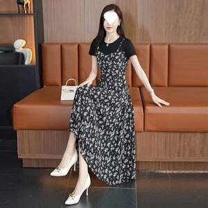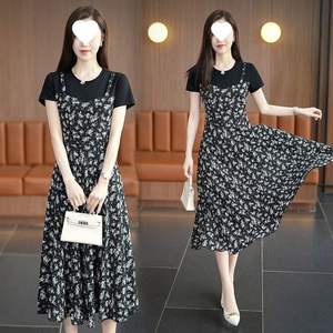 2025新款连衣裙女洋气拼接短袖长裙假两件遮肚显瘦胖mm气质碎花裙