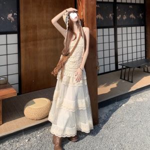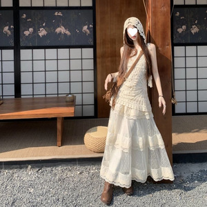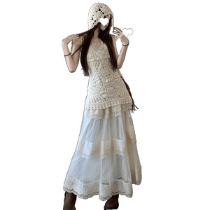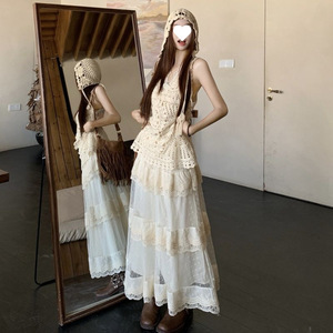 エレガントなエスニックスタイルの中空かぎ針編みデザインニットキャミソールスーツ女性の夏のケーキスカートハーフレングススカート