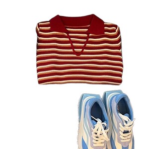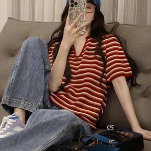 ポロ襟赤ストライプニット半袖Tシャツ夏のレディースファッショナブルでスリムなアイスシルクVネック薄手トップ