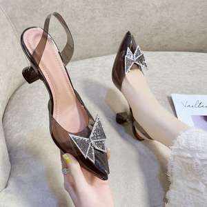 ラインストーン付きワンラインリボンサンダル 2025 夏の新スタイル透明セクシーなフレンチセレブスティレットハイヒール女性用
