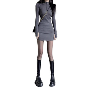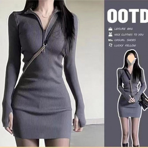 2025新款秋冬针织连衣裙子女紧身包臀裙配大衣内搭拉链领短裙