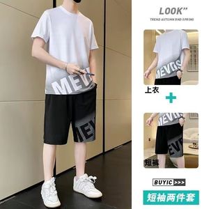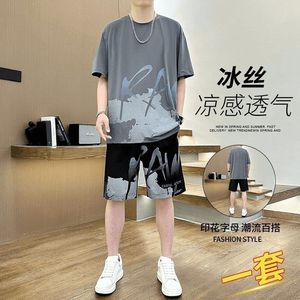 メンズ夏用アイスシルク薄手速乾服、半袖Tシャツ、ショートパンツ、カジュアルスポーツウェア、ハンサムな衣装のセット